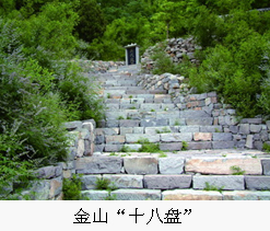 金山像一只金雀兀立于鲁北平原与鲁中山区交界处,其支脉绵延达数十平方公里。该山雄浑中透出灵秀,巍峨中不失清韵。断壁残垣,展示着历史的厚重与文化的深邃。 传说早先张天师东巡齐国故地,远远看见一座高山金光四射。张天师说:“此山祥光普照,护佑四方,百里之内贤人辈出。”从过以后,此山就叫金山了。 金山主峰上有玉皇殿、碧霞圣母行宫、南天门、望海楼、钟鼓楼等十多处古文化建筑遗迹,断壁残垣至今尚存。据碑文记载:玉皇殿、南天门重建于清康熙六年(1667),碧霞圣母行宫、望海楼、钟鼓楼等分别重建于康熙十一年(1672)及雍正、乾隆年间。主峰以下,十八盘中途,现在仍然较完好的“灵官庙”,建于明朝天启元年(1621年),其门右石刻载:“灵官庙谨择于本土金山碧霞行宫十八盘中途设立。”庙旁的古十八盘依然尚在。 当地还流传着许多关于金山的优美的民间故事:山中有一位美丽的姑娘,赶着金马驹儿,碾着金豆子;对母至孝的少年感动了山神,使其找到了打开山门的钥匙……古时山上有只金鸡,每天清晨面向东方引颈长鸣,每当金鸡鸣唱时就会风调雨顺、五谷丰登……