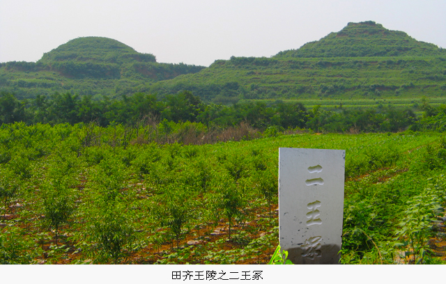 田齐王陵位于齐国故城南7.5千米处的鼎足山和牛山之东,主要在临淄区齐陵街道境内。陵墓包括二王冢、四王冢以及附近的几十座小墓冢,是目前我国现存规模最大的先秦诸侯王陵古墓群,堪称战国王陵的典型代表,被誉为“东方金字塔”。 二王冢,又称二王坟、齐王冢,传为田齐侯剡(yan)与田桓公午之墓。它位于今临淄区齐陵街道郑家沟村西的鼎足山上。山因紫金山、牛首山、菟头山三山呈三足鼎立而得名。二王冢坐落于三山之间,民间有“齐王埋在三山口,临淄永世不为京”的传说。二王冢,因山为坟,封土高大,气势雄伟,如同山上之山。二冢东西并列,方基圆顶,陵台底东西总长296米、南北宽172米,台顶东西230米、南北110米、高16米。二王冢内有一处车马坑与陪葬坑及陪葬墓。