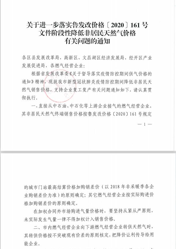 转发《关于进一步落实鲁发改价格[2020]161号文件阶段性降低非居民天然气价格有关问题的通知》的通知
