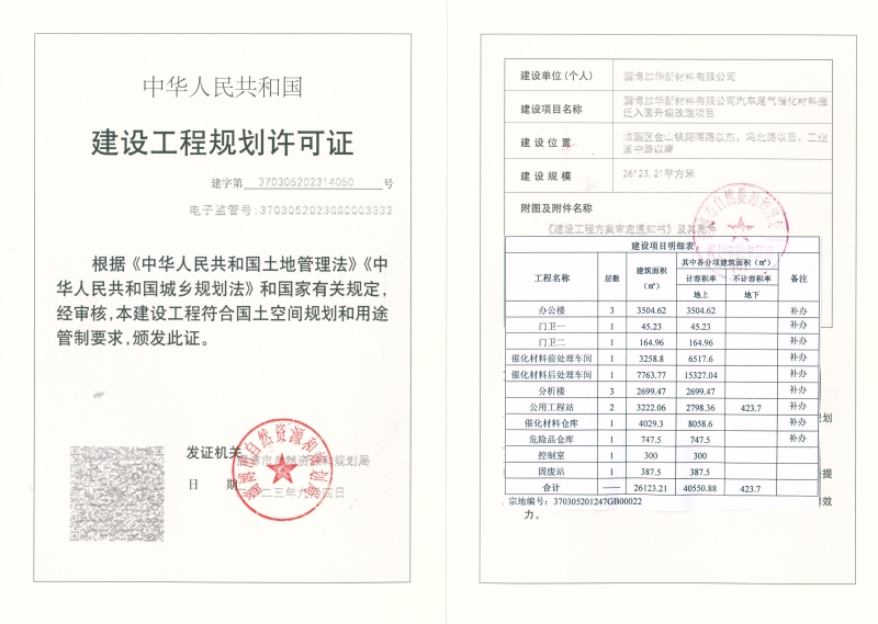 淄博加华新材料有限公司汽车尾气催化材料搬迁入园升级改造项目工程规划许可证