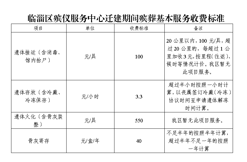 附件:临淄区殡仪服务中心迁建期间殡葬基本服务收费标准