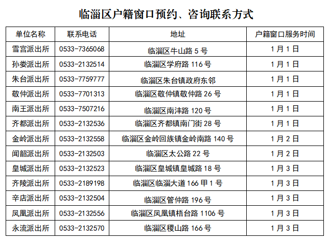 2026年元旦放假期间,为方便群众办理户籍业务,1月1日至3日,全区派出所轮流开门办公并提供预约服务。现将户籍窗口名称、联系电话、地址通告如下: