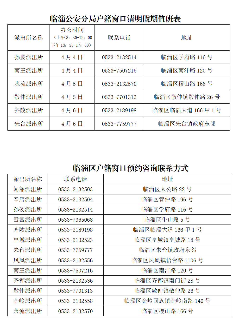 2026年清明放假期间,为方便群众办理户籍业务,4月4日至6日,临淄公安分局户籍窗口实行“轮值服务+预约服务”双保障模式,孙娄、南王、永流、敬仲、齐陵、朱台派出所户籍窗口实行轮值服务,全区派出所户籍窗口提供预约服务。现将户籍窗口轮值服务时间、预约咨询联系方式通告如下: