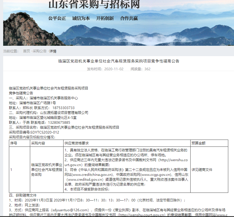 临淄区党政机关事业单位社会汽车租赁服务采购项目竞争性磋商公告