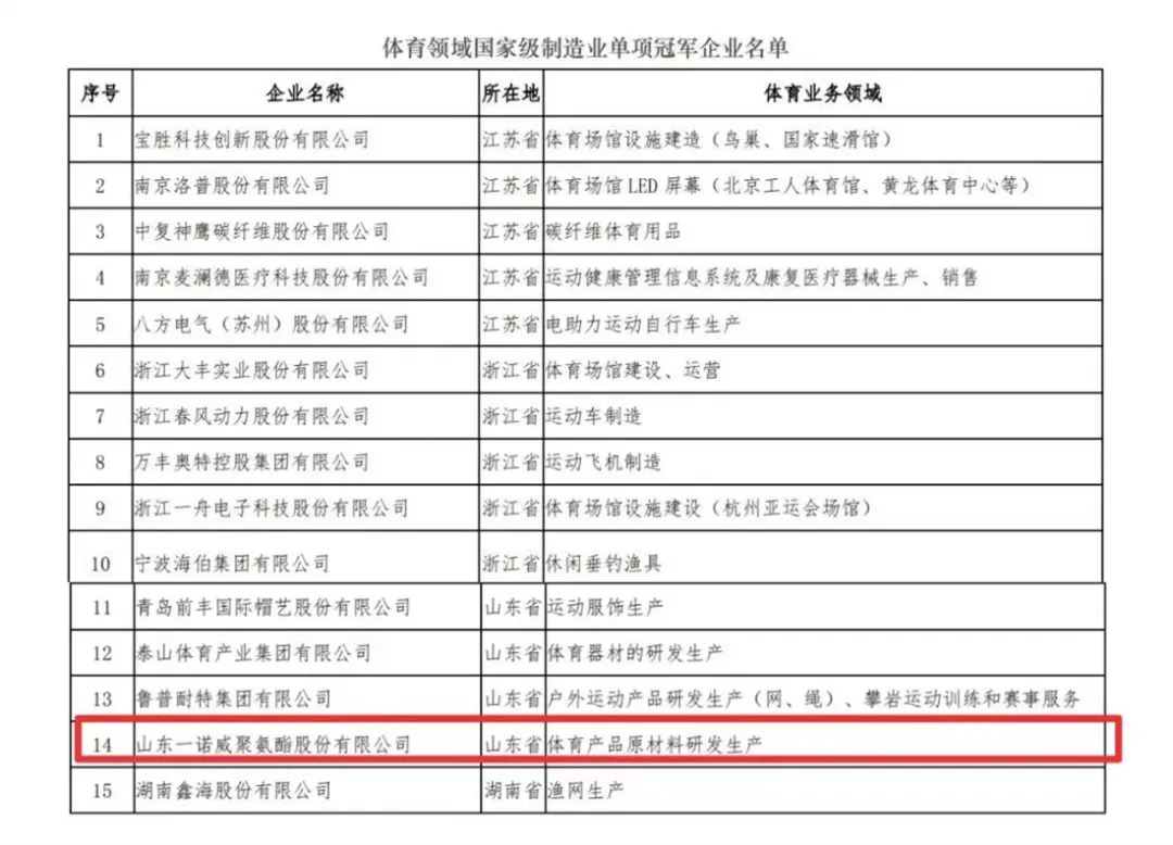 一诺威引领聚氨酯产业入选体育领域国家级制造业单项冠军。山东一诺威新材料有限公司生产的组合聚醚多元醇产品获得山东省制造业单项冠军企业,公司不断完善和优化产品体系,拓宽新型运用领域,形成聚醚-组合聚醚完备的上下游产业链,工艺技术水平全球领先。新项目建成后,在聚醚-组合聚醚领域稳居行业第二。