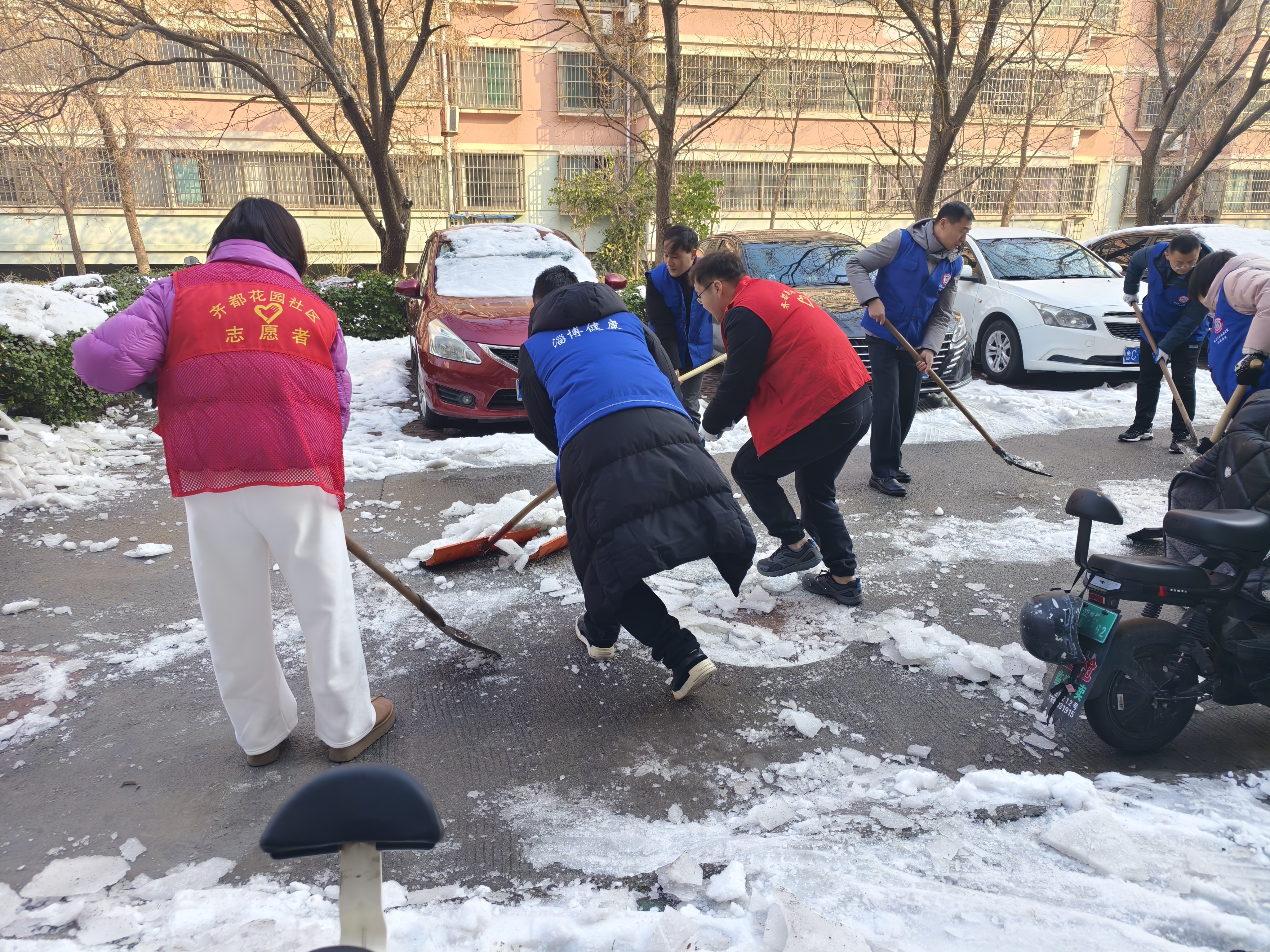 社区工作人员和“双报到”单位志愿者、红色楼(单)长等手持铁锹、扫帚等工具,对辖区背阴小巷、车位等还有积雪的位置进行清理,保障居民的出行安全。
