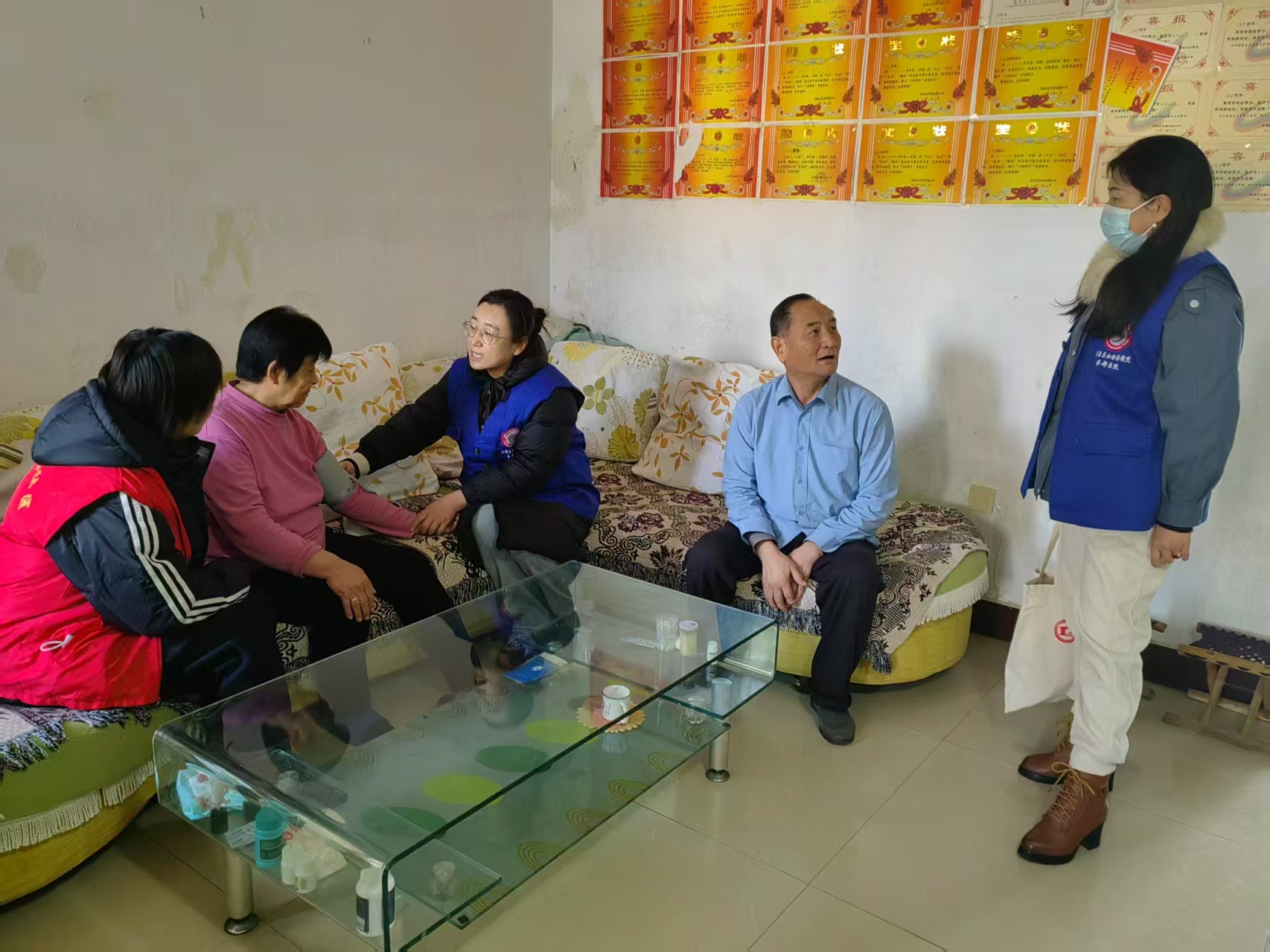 “24刻”志愿服务队的志愿者和“双报到”单位齐都医院医生一起到辖区老人家中进行走访,询问老人的身体状况、既往病史及用药史等,为老人量血压、宣传健康知识、提供健康指导。