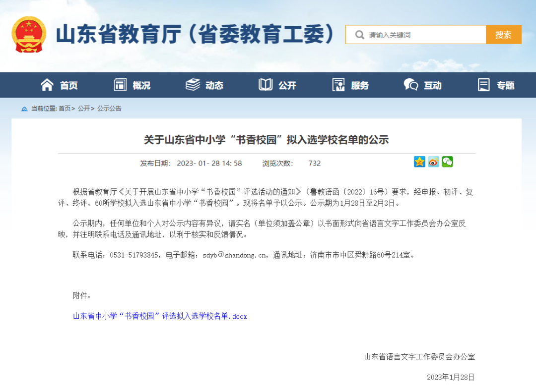 1月28日,山东省教育厅公示山东省中小学“书香校园”拟入选学校名单。经申报、初评、复评、终评,60所学校拟入选山东省中小学“书香校园”,我区稷下小学拟入选。