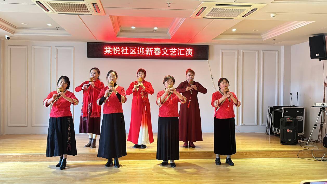 葫芦丝合奏《映山红》丝韵悠扬,奏响新春乐章。阿姨们身着红黑相间的演出服,手持葫芦丝整齐列队,指尖流转间,悠扬婉转的旋律便充盈了整个大厅。乐声时而轻快灵动,时而温婉绵长,每一个音符都饱含着对社区的热爱,瞬间将现场氛围带入温馨的新春情境中。