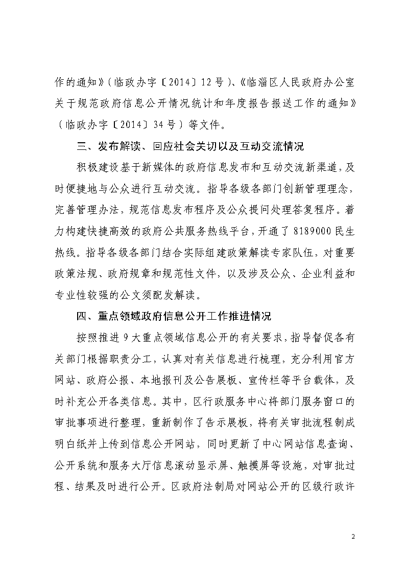 临淄区人民政府办公室2014年度政府信息公开工作年度报告