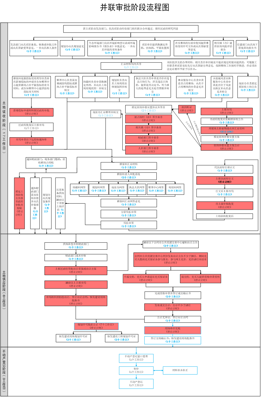 按照项目审批主要内容和审批时序,将“拿地即开工”审批模式划分为立项预审、并联审批、施工许可(拿地开工)三个阶段,每个审批阶段实行“一个部门牵头、并联审批、限时办结”。
