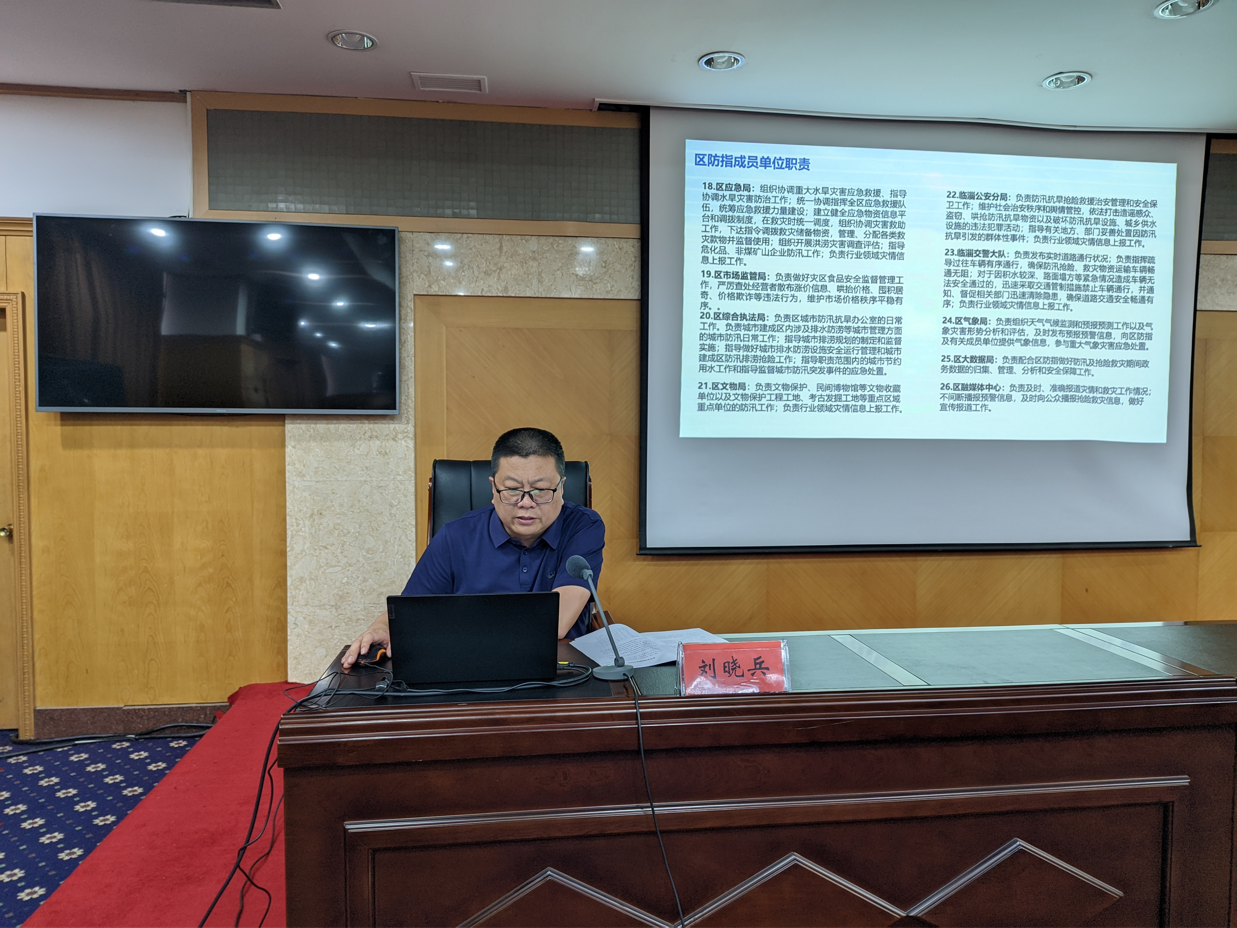 区水利局局长刘晓兵同志负责培训防汛抗旱指挥体系、职责分工、应急响应、水利工程防汛相关工作;区综合执法局局长徐学建同志负责培训城市防汛重点部位安全运行管理、应急抢险相关内容;区应急局局长徐志信同志负责培训抢险救灾物资调拨、队伍组建、灾情上报处置等相关工作。
