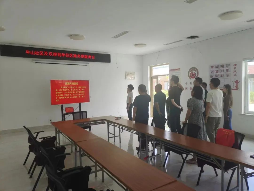 在牛山社区党群服务中心开展了党性教育,全体党员干部通过重温入党誓词坚守初心、担当使命,进一步增强自身的敬畏意识、宗旨意识和担当意识,努力践行对党的庄严承诺,以更加积极进取的精神状态全力以赴投入到新时代商务工作中。