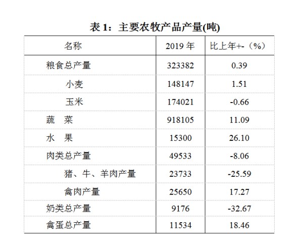 全年实现农林牧渔业总产值68.5亿元,按不变价格计算,比上年增长1.3%。其中,农业产值46.8亿元,增长4.4%;林业总产值0.91亿元,增长1.9%;牧业总产值17.2亿元,下降8.4%。全年粮食总产量32.3万吨。其中,夏粮产量14.8万吨,比上年增长1.5%;秋粮产量17.5万吨,比上年下降0.5%。粮食播种面积69.3万亩,比上年减少1.9万亩。播亩单产467公斤,比上年增加14公斤。蔬菜产量91.8万吨,比上年增长11.1%。水果产量1.5万吨,比上年增长26.1%。