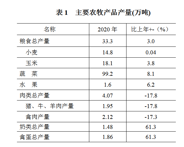 全年实现农林牧渔业总产值73.5亿元,按可比价格计算,比上年增长3.4%。其中,农业产值51.1亿元,增长9.2 %;林业总产值0.9亿元,与上年持平;牧业总产值17.8亿元,增长3.5%。全年粮食总产量33.3万吨。其中,夏粮产量14.8万吨,比上年增长0.04%;秋粮产量18.5万吨,比上年增长5.4%。粮食播种面积69.3万亩,播亩单产480公斤,比上年增加13公斤。蔬菜产量99.2万吨,比上年增长8.0%。水果产量1.63万吨,比上年增长6.2%。