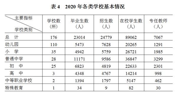 年末全区拥有幼儿园110所,在园幼儿数2.0万人,专任教师师生比为1:16;义务教育阶段小学招生5759人,专任教师师生比为1:13;初中招生4819人,专任教师师生比为1:10;普通高中招生4767人,专任教师师生比为1:14;特殊教育招生9人,专任教师师生比为1:3。