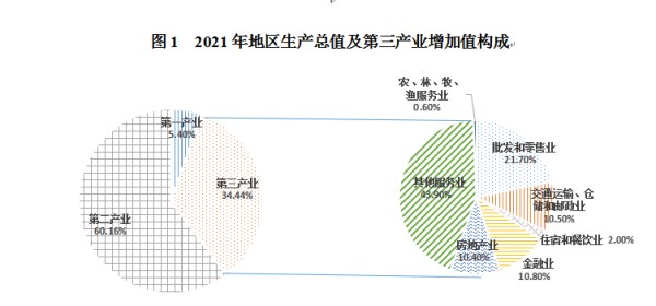 根据市统计局统一初步核算,2021年全区生产总值为859.9亿元,按可比价计算,比上年增长10.2%。分产业看,第一产业增加值为46.4亿元,比上年增长7.9%;第二产业增加值为517.3亿元,比上年增长10.8%;第三产业增加值为296.1亿元,比上年增长9.7%。三次产业比调整为5.40:60.16:34.44。