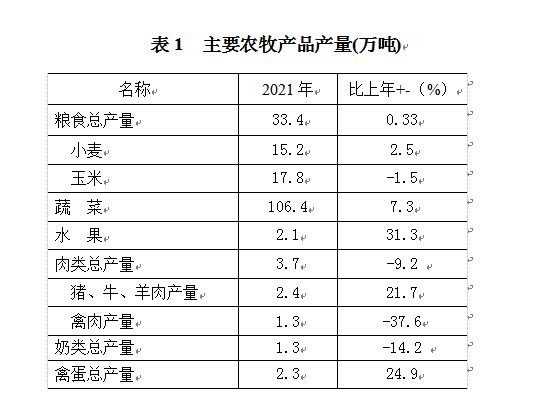 全年实现农林牧渔业总产值85.9亿元,按可比价计算增长9.4%。其中,农业产值60.3亿元,增长5.9 %;林业总产值0.9亿元,增长2.9%;牧业总产值20.6亿元,增长19.6%。全年粮食总产量33.4万吨。其中,夏粮产量15.2万吨,比上年增长2.5%;秋粮产量18.2万吨,比上年下降1.4%。粮食播种面积69.5万亩,播亩单产480.8公斤,比上年增加0.1公斤。蔬菜产量106.4万吨,比上年增长7.3%。水果产量2.1万吨,比上年增长31.3%。