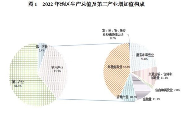 根据市统计局统一初步核算,2022年全区生产总值为903.3亿元,按可比价计算,比上年增长4.0%。分产业看,第一产业增加值为48.7亿元,比上年增长4.5%;第二产业增加值为554.1亿元,比上年增长4.1%;第三产业增加值为300.6亿元,比上年增长3.8%。三次产业比调整为5.4:61.3:33.3。