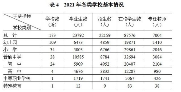 年末全区普通中学、小学、幼儿园数量分别为28所、34所、109所,在校学生数分别为3.3万人、3.0万人、2.0万人,专任教师数量分别为3084人、2046人、1410人。