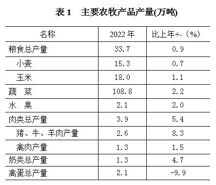 全年实现农林牧渔业总产值91.3亿元,按可比价计算增长4.9%。其中,农业产值64.9亿元,增长5.5 %;林业总产值1.0亿元,增长10.4%;牧业总产值20.8亿元,增长1.6%。全年粮食总产量33.7万吨。其中,夏粮产量15.3万吨,比上年增长0.7%;秋粮产量18.4万吨,比上年增长1.1%。粮食播种面积69.8万亩,播亩单产483.0公斤,比上年增加2.2公斤。蔬菜产量108.8万吨,比上年增长2.2%。水果产量2.1万吨,比上年增长2.0%。
