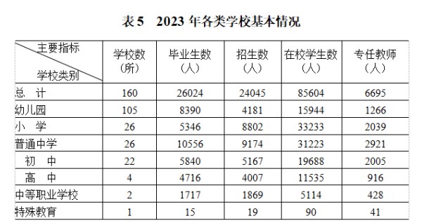 年末全区普通中学、小学、幼儿园数量分别为26所、26所、105所,在校学生数分别为3.1万人、3.3万人、1.6万人,专任教师数量分别为2921人、2039人、1266人。