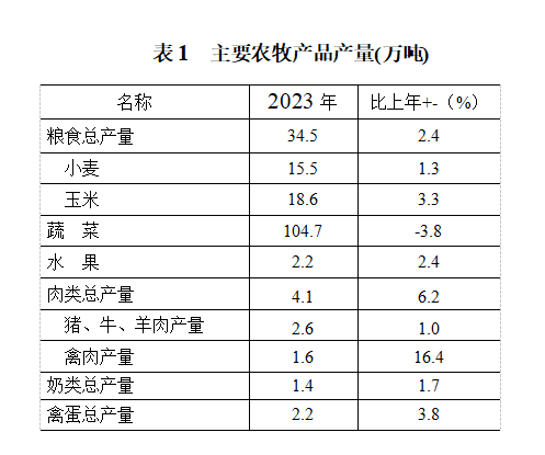 全年实现农林牧渔业总产值93亿元,按可比价计算增长5.1%。其中,农业产值66.9亿元,增长4.3%;林业产值1.0亿元,增长12.1%;牧业产值19.9亿元,增长6.5%;农林牧渔业及辅助性活动产值5.1亿元,增长11.4%。全年粮食总产量34.5万吨。其中,夏粮产量15.5万吨;秋粮产量19.1万吨。粮食播种面积70.0万亩,播亩单产493.3公斤,比上年增加10.3公斤。蔬菜产量104.7万吨。水果产量2.1万吨,比上年增长2.0%。