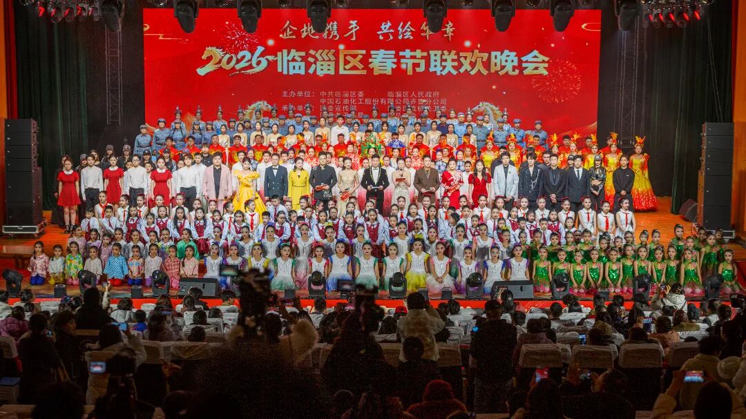区领导张召才、杨晓军、崔赟、高晋,齐鲁石化公司领导慕常强、魏建民、高鹏出席。各镇人民政府、街道办事处主要负责人,区委宣传部分管领导,区委区直机关工委、区委老干部局、区总工会、团区委、区教体局、区文旅局、区融媒体中心主要负责人,部分人大代表、政协委员、劳模代表及各行业代表;区直部门干部职工、齐鲁石化职工代表及社会各界群众到场观看。本次活动由中共临淄区委、临淄区人民政府、中国石油化工股份有限公司齐鲁分公司主办,区委宣传部、区委区直机关工委、区委老干部局、区总工会、团区委、区教体局、区文旅局、区融媒体中心承办。晚会现场16个节目轮番登场,节目形式多样,融合歌舞、小品、音诗画、朗诵于一体,近千名演员倾情演绎,尽显临淄深厚文化底蕴与独特艺术风采,尽展齐地风韵与新春喜气。整台晚会将非遗传承、时代新风与地方特色巧妙融合,现场掌声、欢呼声此起彼伏,年味十足,暖意融融。