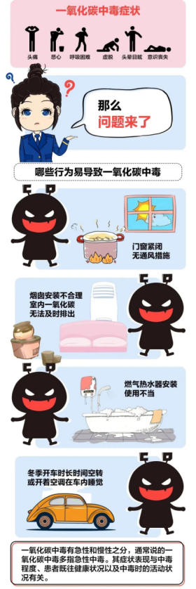 随着天气逐步变冷,又到了一氧化碳中毒高发期。烧炭取暖、在密闭室内吃火锅烧烤、使用燃气热水器时通风不良、停车闭窗吹空调等看似平常的行为都可能在不知不觉中造成一氧化碳中毒。作为罪魁祸首的一氧化碳是一种无色、无臭、无味的气体,吸入后可能导致中毒昏迷,甚至危及生命。