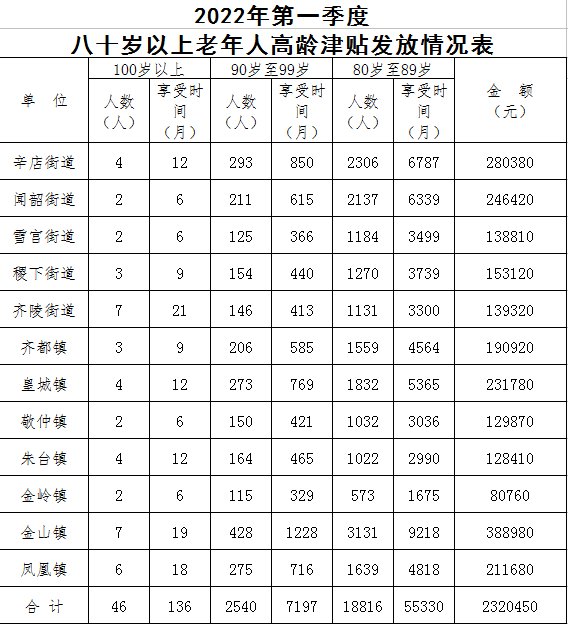 2022年第一季度八十岁以上老年人高龄津贴发放情况