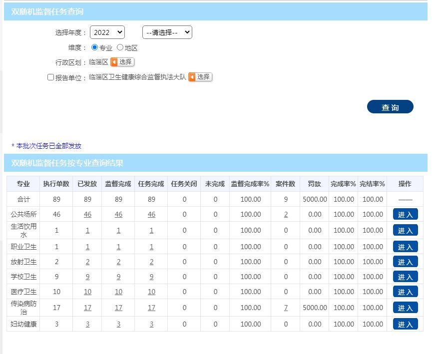 为进一步加强公共卫生、传染病防治、职业卫生、医疗卫生监督执法工作,根据《国家卫生健康委办公厅关于印发2022年国家随机监督抽查计划的通知》和《山东省卫生健康委员会关于印发〈2022年全省卫生健康随机监督抽查实施方案〉的通知》要求,我局于2022年在全区范围对89家任务单位开展“双随机、一公开”监督检查,监督完结率100%,立案9起,先将详细结果公示如下: