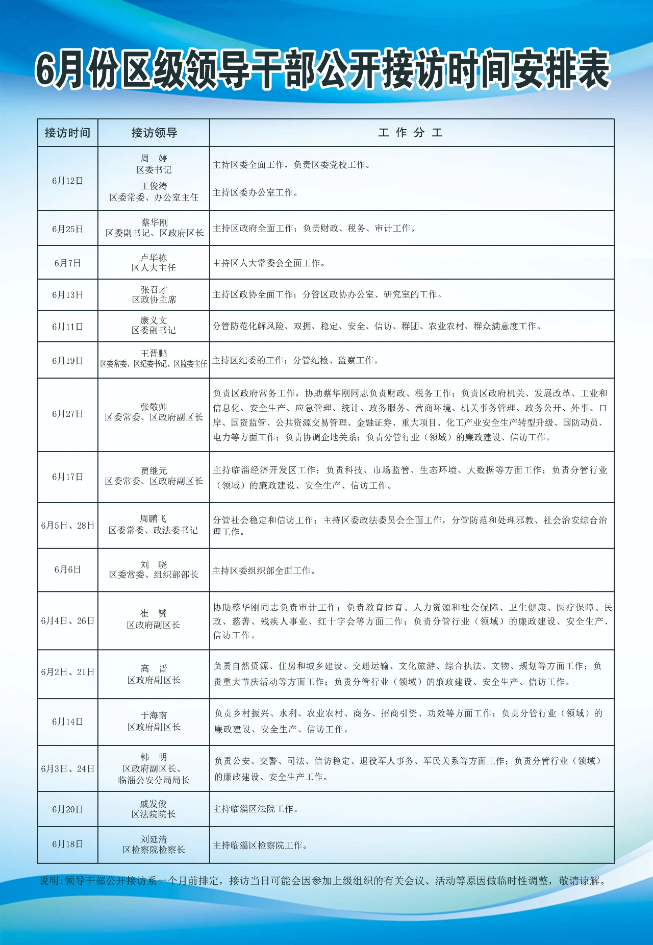 区信访局6月份区级领导干部公开接访时间安排表
