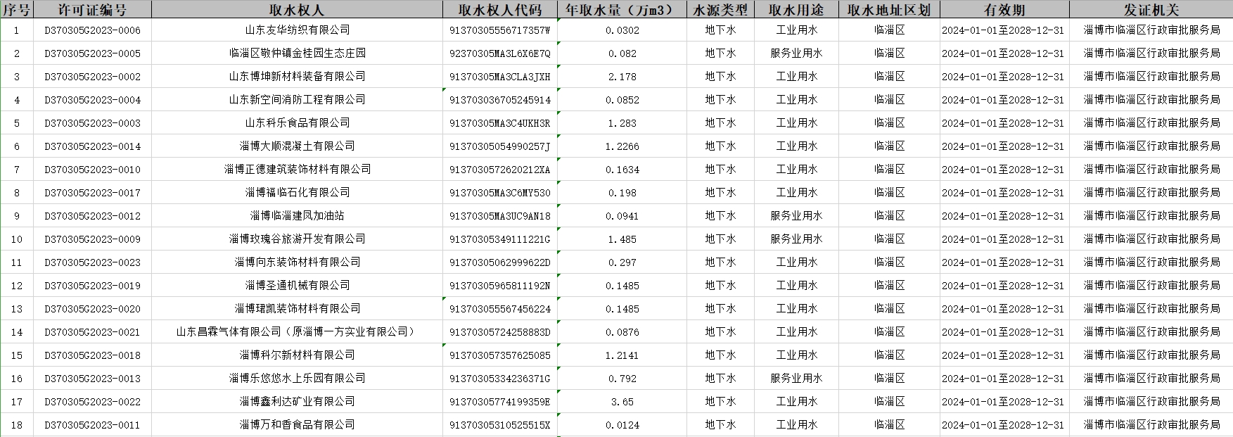 关于山东博坤新材料装备有限公司等18家用水单位取水许可延续的公示,详情请见下表: