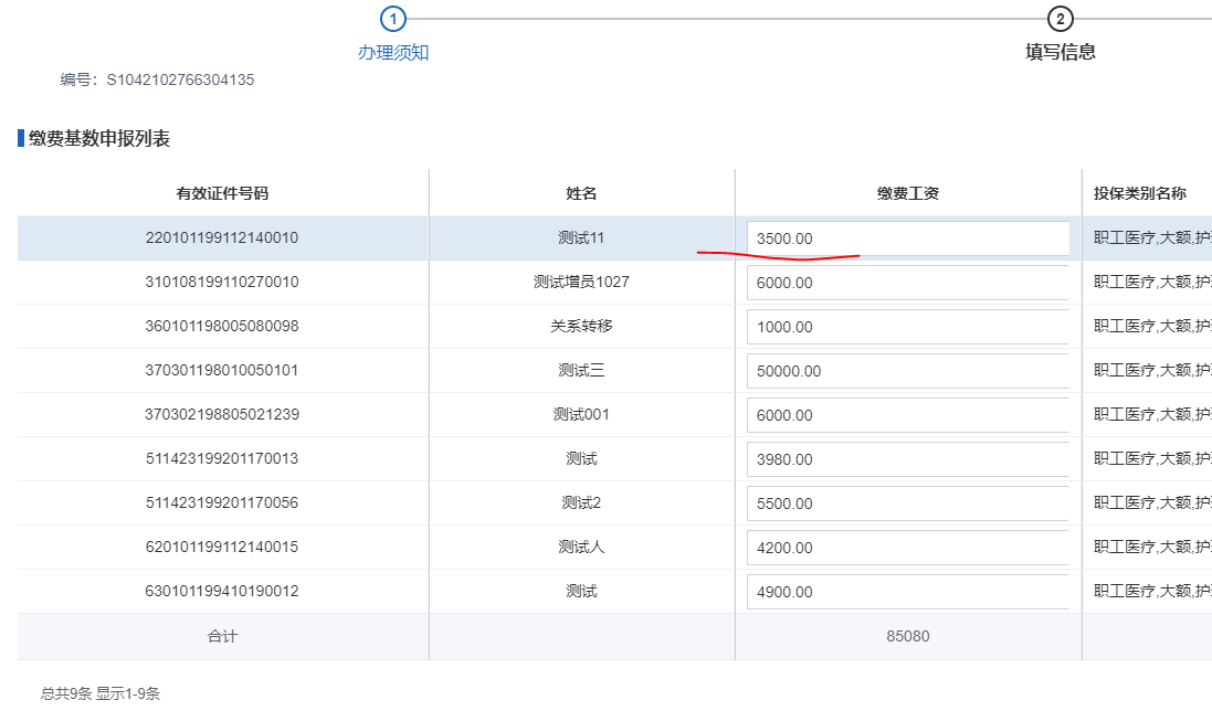 注意:1.缴费工资如低于当前下限或高于上限应按实际核定的工资填报,不能直接按上下限填报,否则系统比对会出错。如平均工资为3500,则填入3500即可;平均工资为25000,填报25000即可,而不是填写目前的最低缴费基数4242或最高限21207))。2.申报的缴费工资应与社保系统申报的缴费工资保持一致。