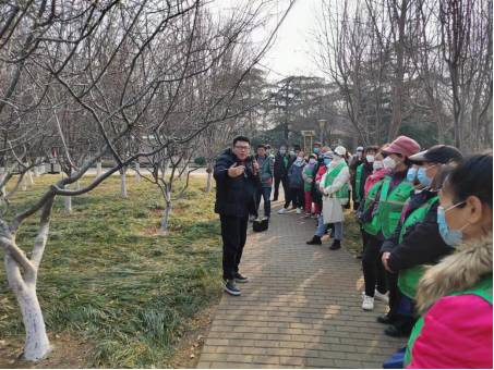 临淄区市政园林环卫事务服务中心王磊科长在齐园现场为大家培训园林植物春季修剪及注意事项,就春季景观花卉的布置、花灌木修剪、杂草的清理、苗木的施肥等养护工作进行面对面互动,手把手传授指导。