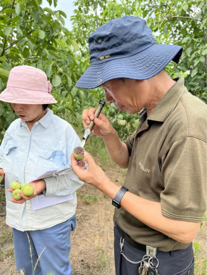 在活动现场,参加人员向种植户发放了《核桃主要病虫害及防治》《枣树的主要病虫害和防治方案》等材料。针对南杨村种植户反映的问题,查看了树木长势及病虫害情况,对发现的枣疯病、核桃炭疽病和猕猴桃黄化病给出了有针对性的治疗方案,并对果园管理提出了意见和建议。
