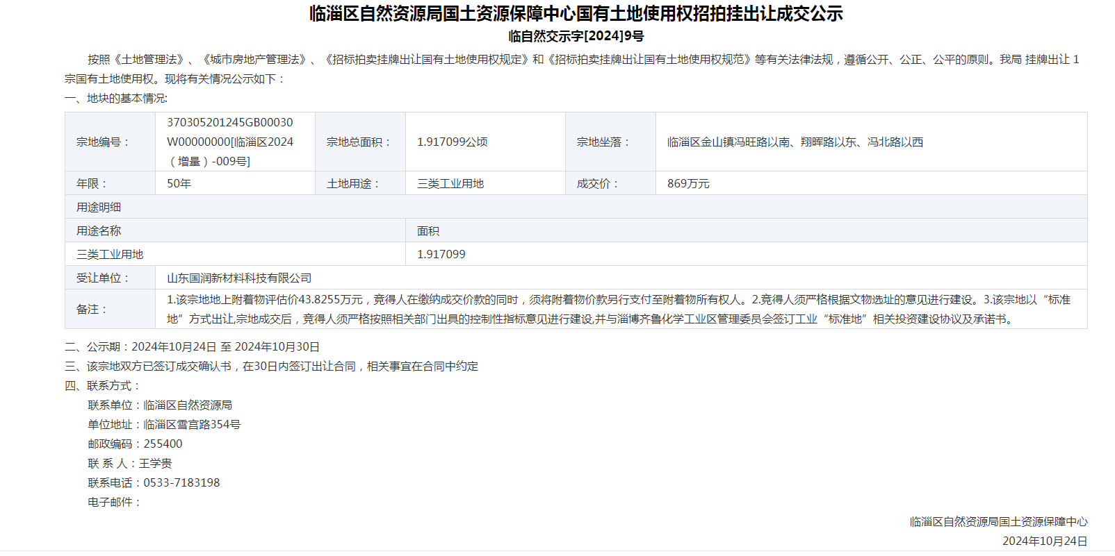 淄博市临淄区自然资源局国有土地使用权招拍挂出让成交公示临自然交示字[2024]9号