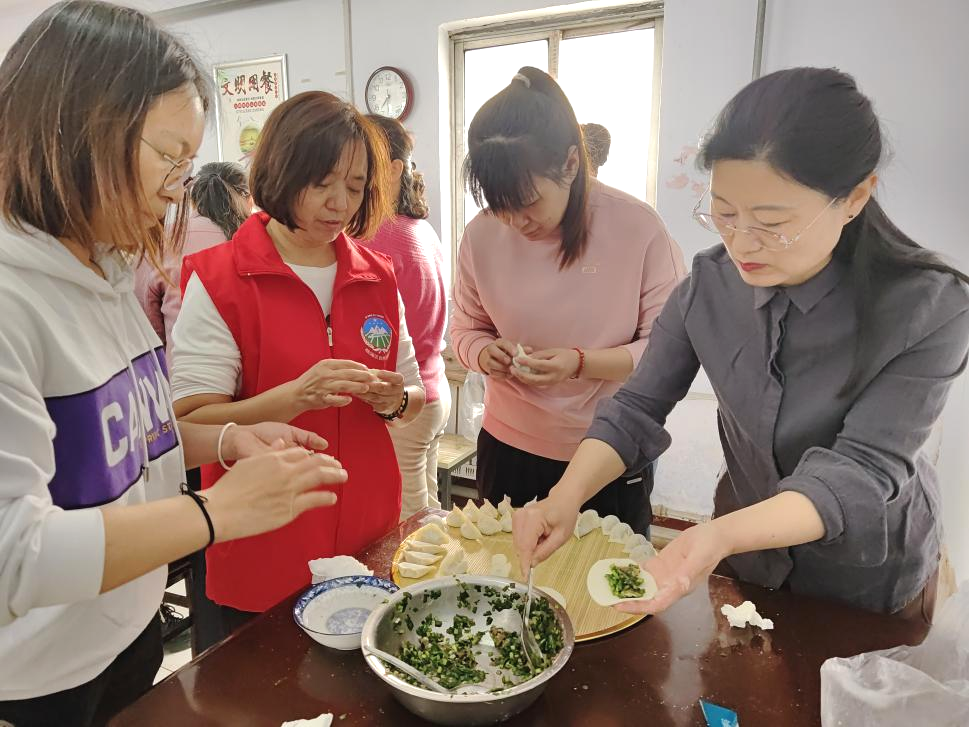 大家来到林场食堂,妇委会成员发放临淄区女性安康项目说明书,讲解有关福利政策。随后,妇女职工们其乐融融的包起了水饺。大家分工协作,擀面皮、拌馅、包饺子,争先恐后、各显其能,元宝饺、月牙饺、花边饺…看着自己的劳动成果,大家内心充满了成就感和幸福感。